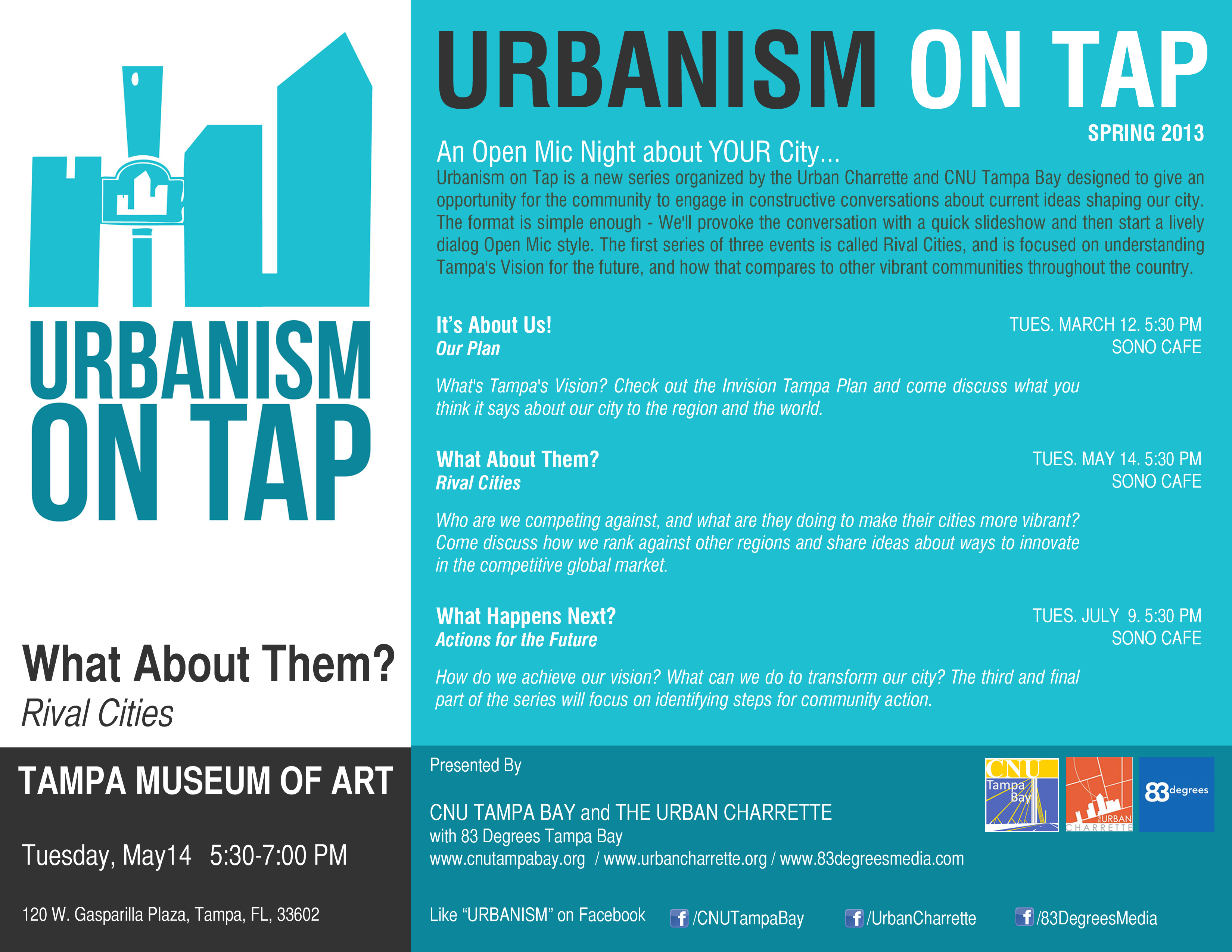 Urbanism on Tap is a new series organized by CNU Tampa Bay and The Urban Charrette designed to give an opportunity for the community to engage in constructive conversations about current ideas shaping our city. The format is simple enough – We’ll provoke the conversation with a quick slideshow and then start a lively dialog Open Mic style.