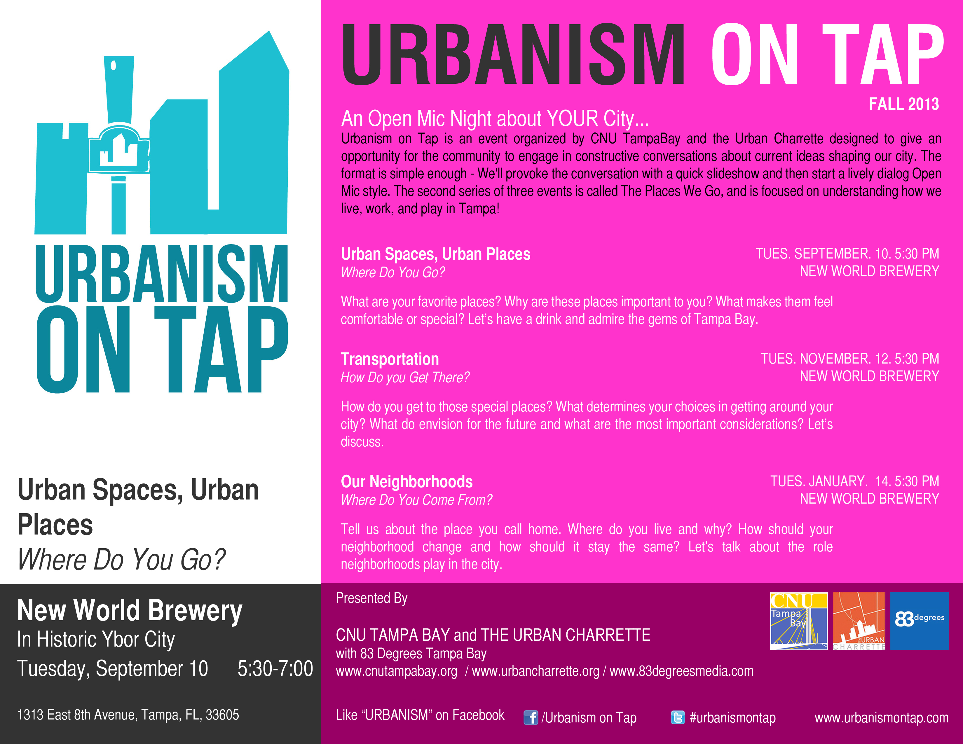 Urbanism on Tap is an event organized by CNU TampaBay and the Urban Charrette designed to give an opportunity for the community to engage in constructive conversations about current ideas shaping our city. The format is simple enough – We’ll provoke the conversation with a quick slideshow and then start a lively dialog Open Mic style.